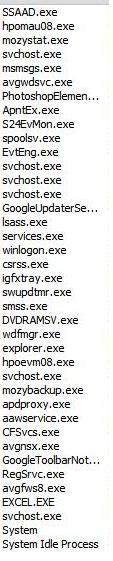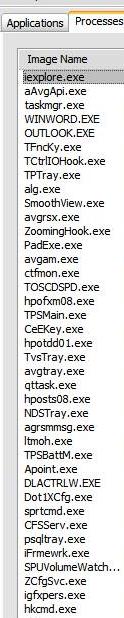 Then, open task manager again, and start by "end processing" IEXPLORE.EXE, WINWORD.EXE, SMOOTHVIEW.EXE, ZOOMINGHOOK.EXE, EXCEL.EXE, GOOGLETOOLBAR... , PHOTOSHOPELEMENTS...